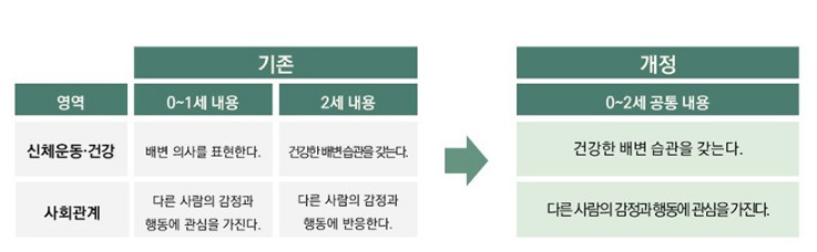 특히 '기본생활과 신체운동' 영역이 '신체운동·건강' 영역으로 통합되었습니다.