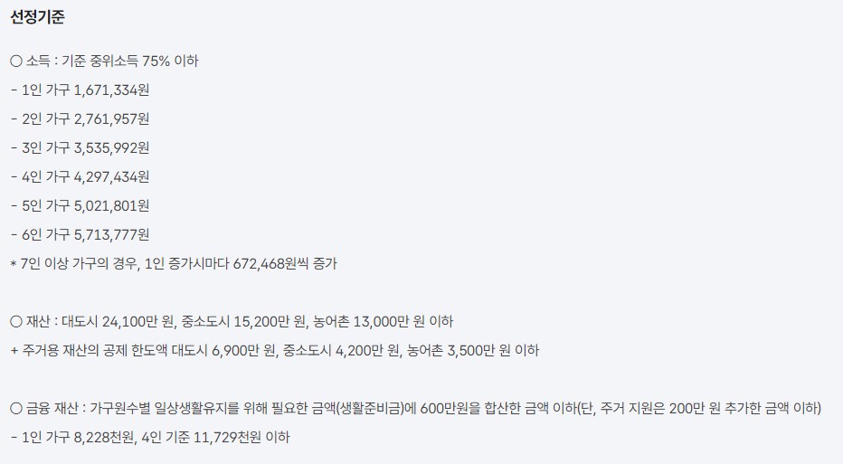 - 소득 기준 : 가구의 소득이 기준 중위소득 75% 이하일 경우 신청 가능합니다.