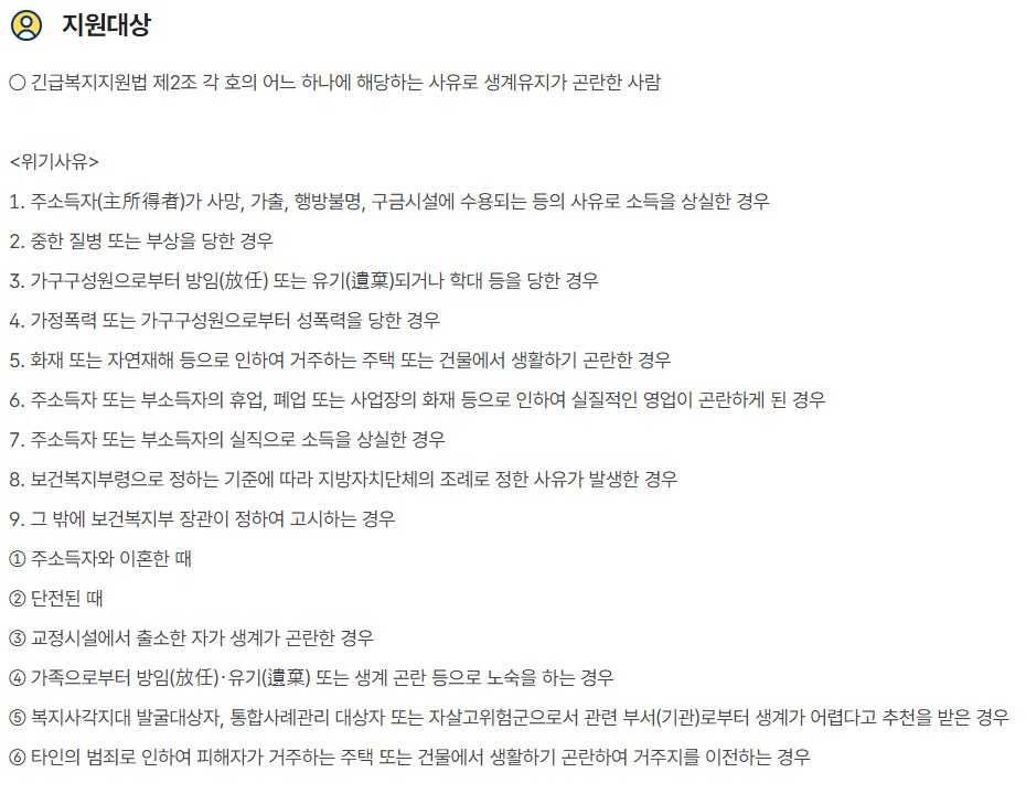 - 위기 사유 : 주소득자의 실직, 중한 질병, 재난 등으로 인해 생계유지가 어려운 상황이어야 합니다.