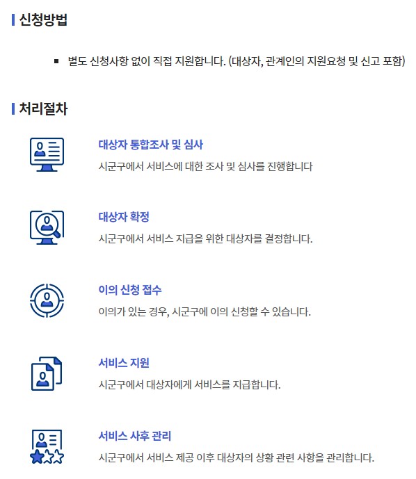 - 방문 신청 : 관할 시군구청 또는 읍면동 주민센터에 직접 방문하여 신청할 수 있습니다.