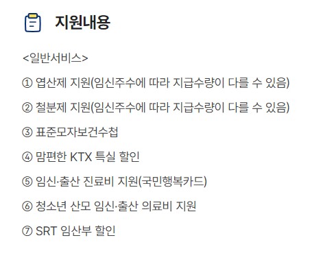 - 모자보건수첩 제공 : 임산부와 신생아의 건강 상태를 기록하고 관리할 수 있는 수첩이 제공됩니다.