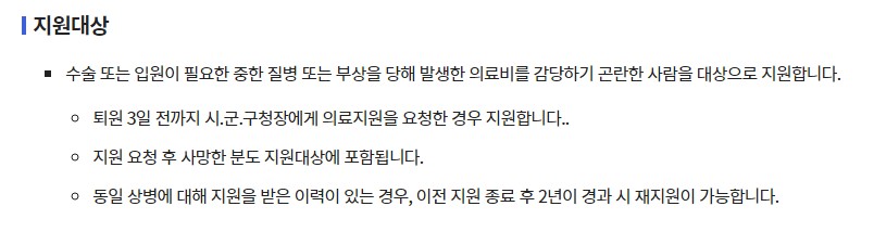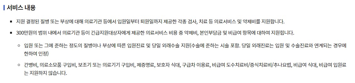 - 의료비 지원 : 의료비는 1회 지원으로 최대 300만원까지 지원됩니다. 이 금액은 본인부담금 및 일부 비급여 항목에 사용될 수 있습니다.