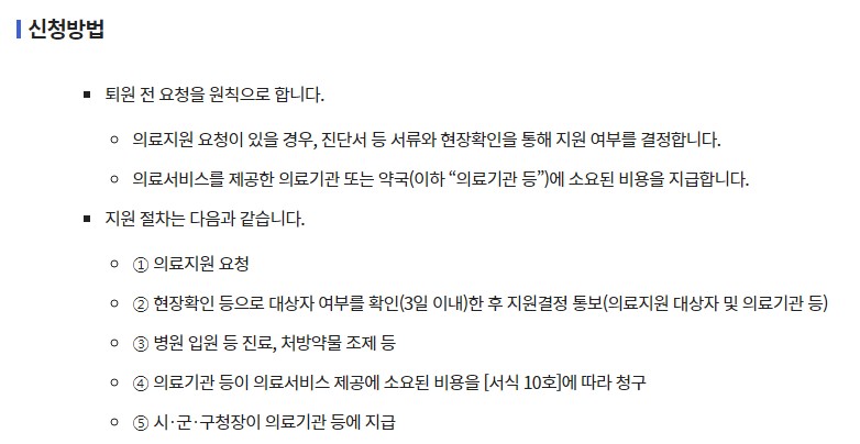 - 신청서 작성 : 긴급의료비 지원 신청서를 작성해야 합니다. 이 신청서는 해당 지역의 주민센터나 복지관에서 받을 수 있습니다.