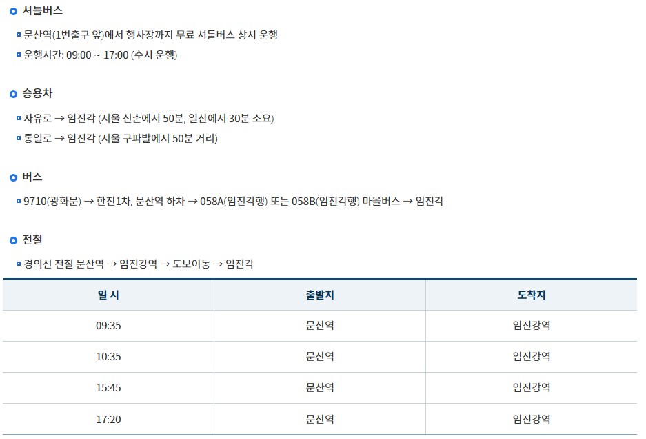 대중교통을 이용하시는 것을 추천드립니다. 문산역에서 무료 셔틀버스가 운행되며, 임진각 광장까지 편리하게 이동할 수 있습니다. 셔틀버스는 축제 기간 동안 정기적으로 운행되니, 시간표를 확인하시고 이용하시기 바랍니다.
