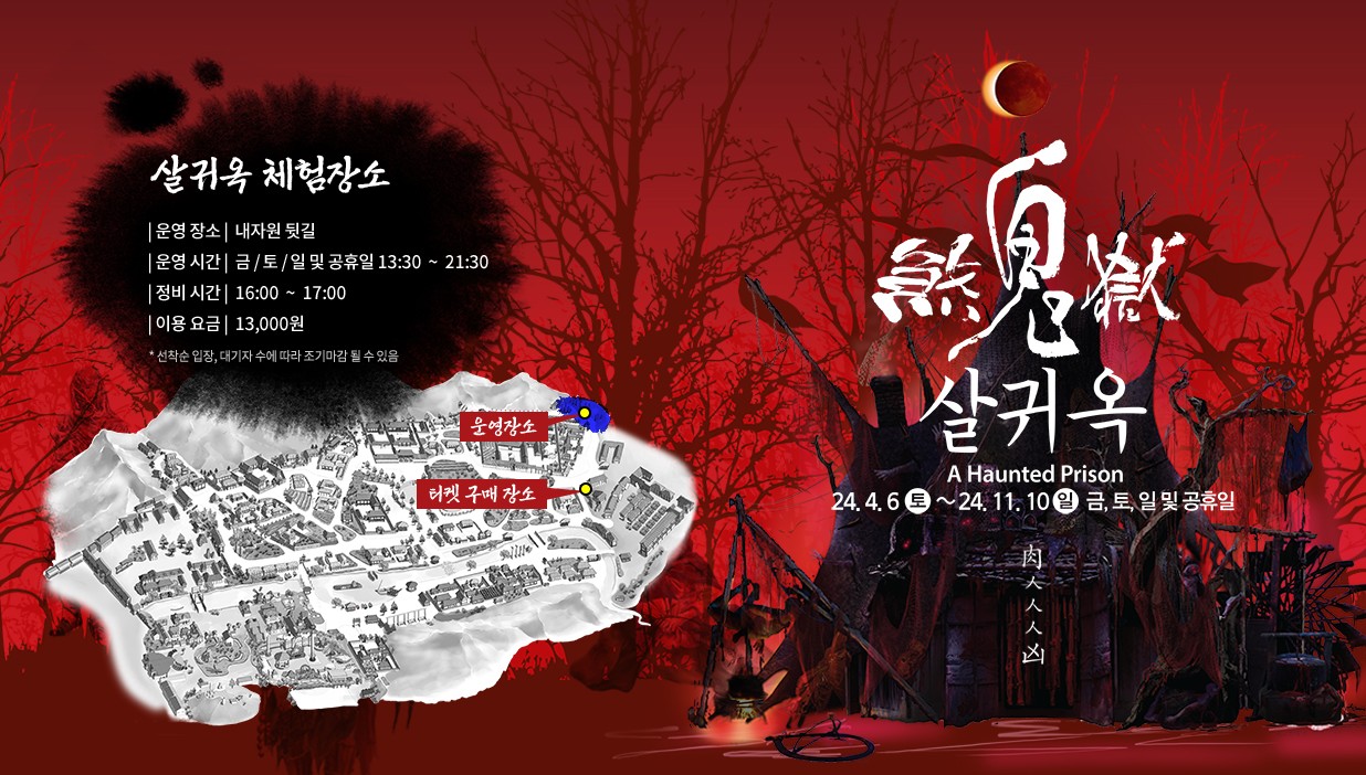 살귀옥은 한국민속촌의 특별한 행사로, 야경과 함께 즐길 수 있는 다양한 프로그램이 마련되어 있습니다.